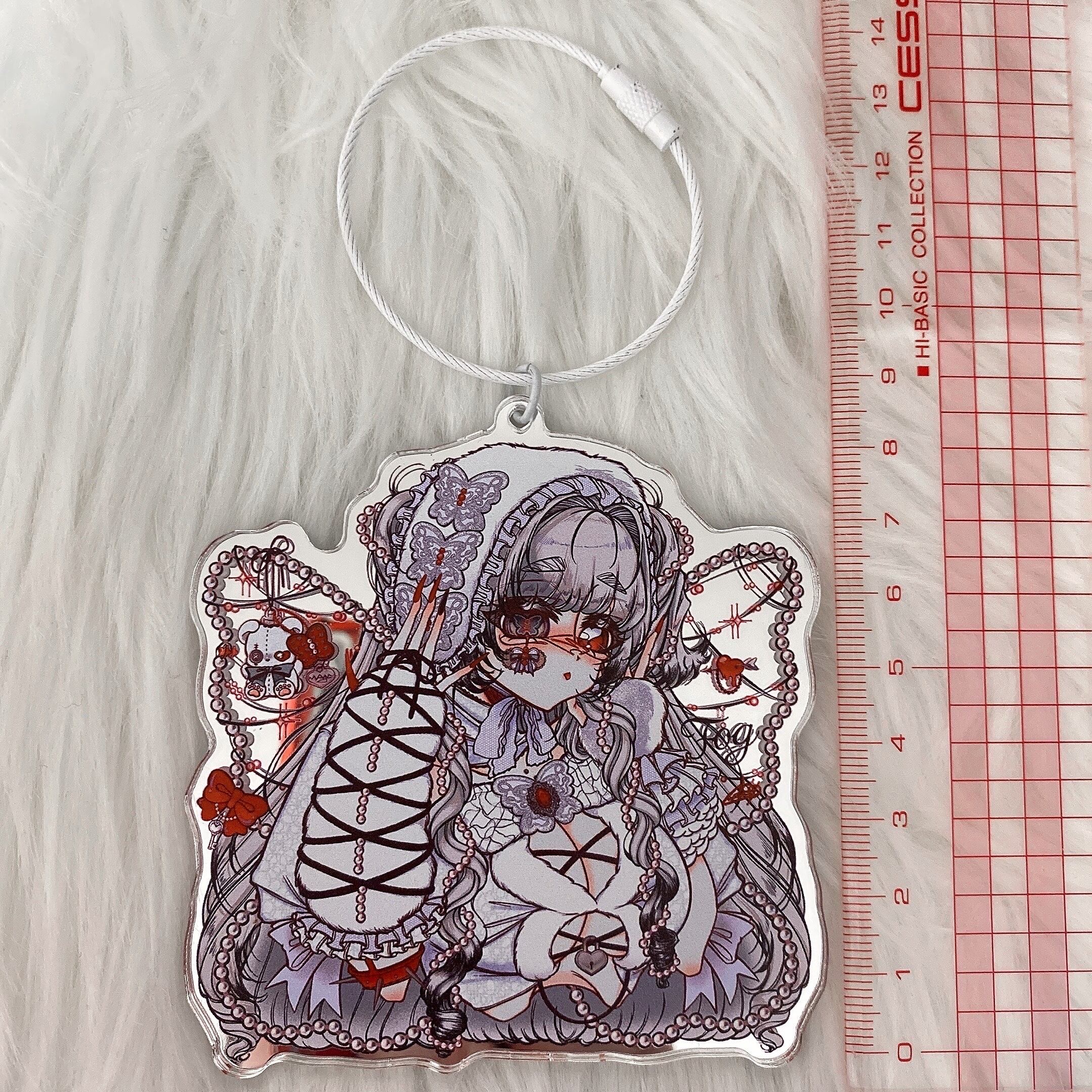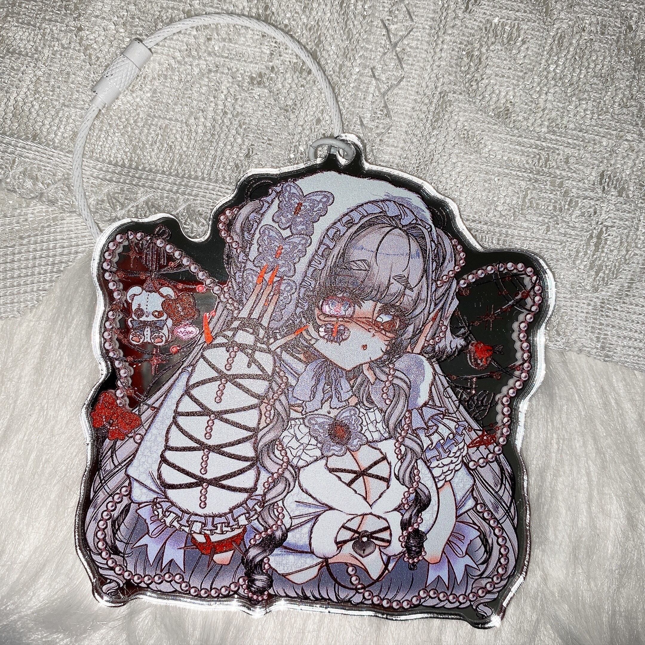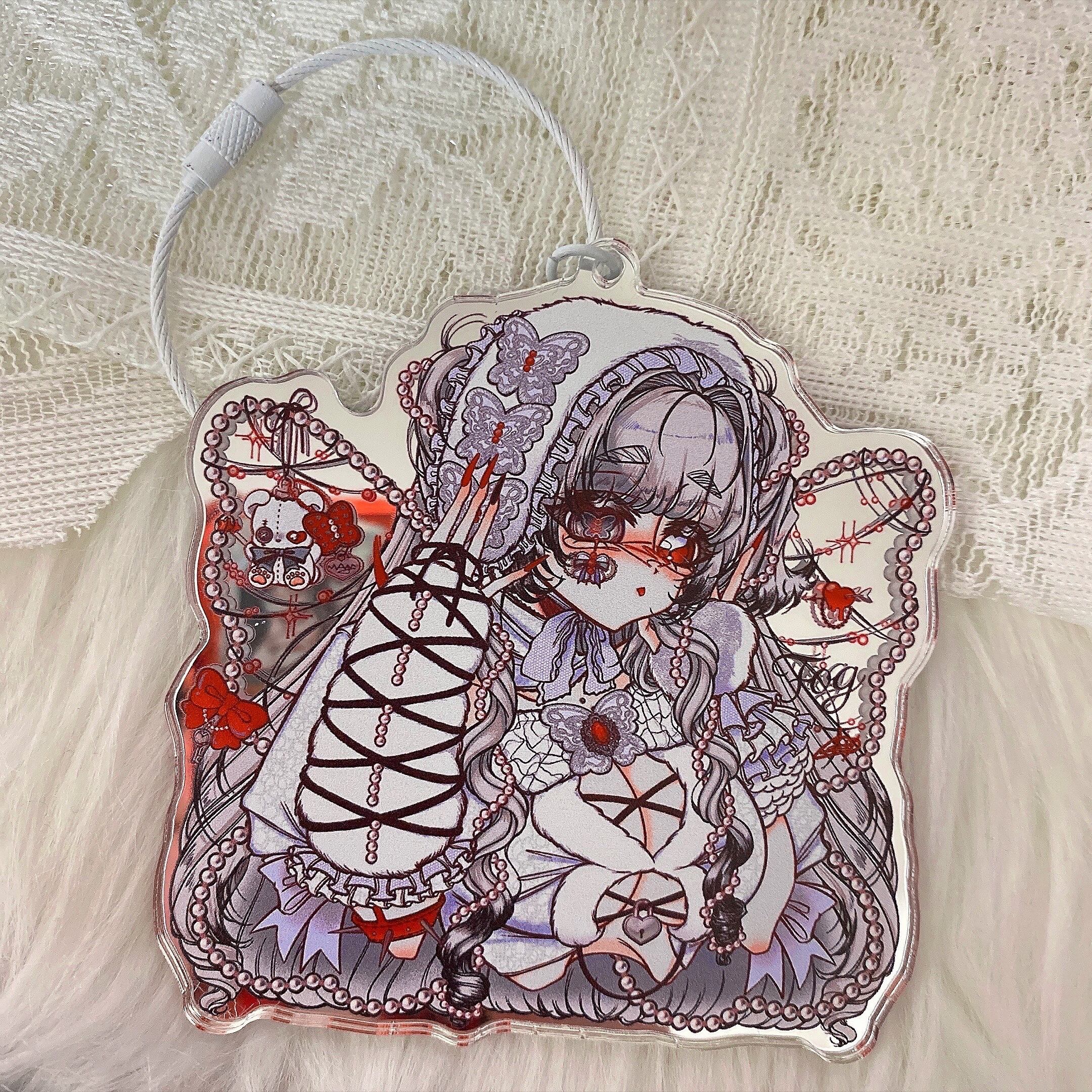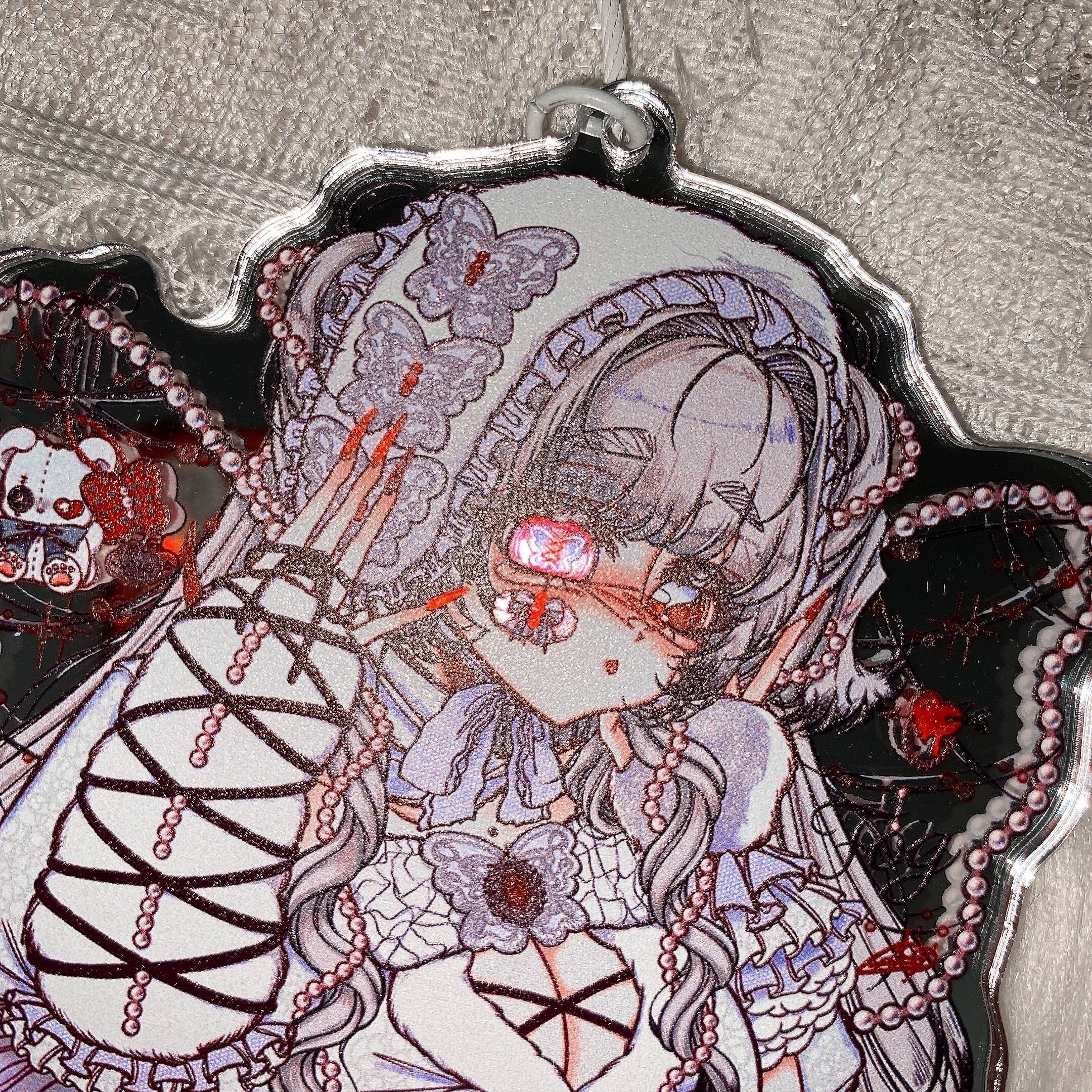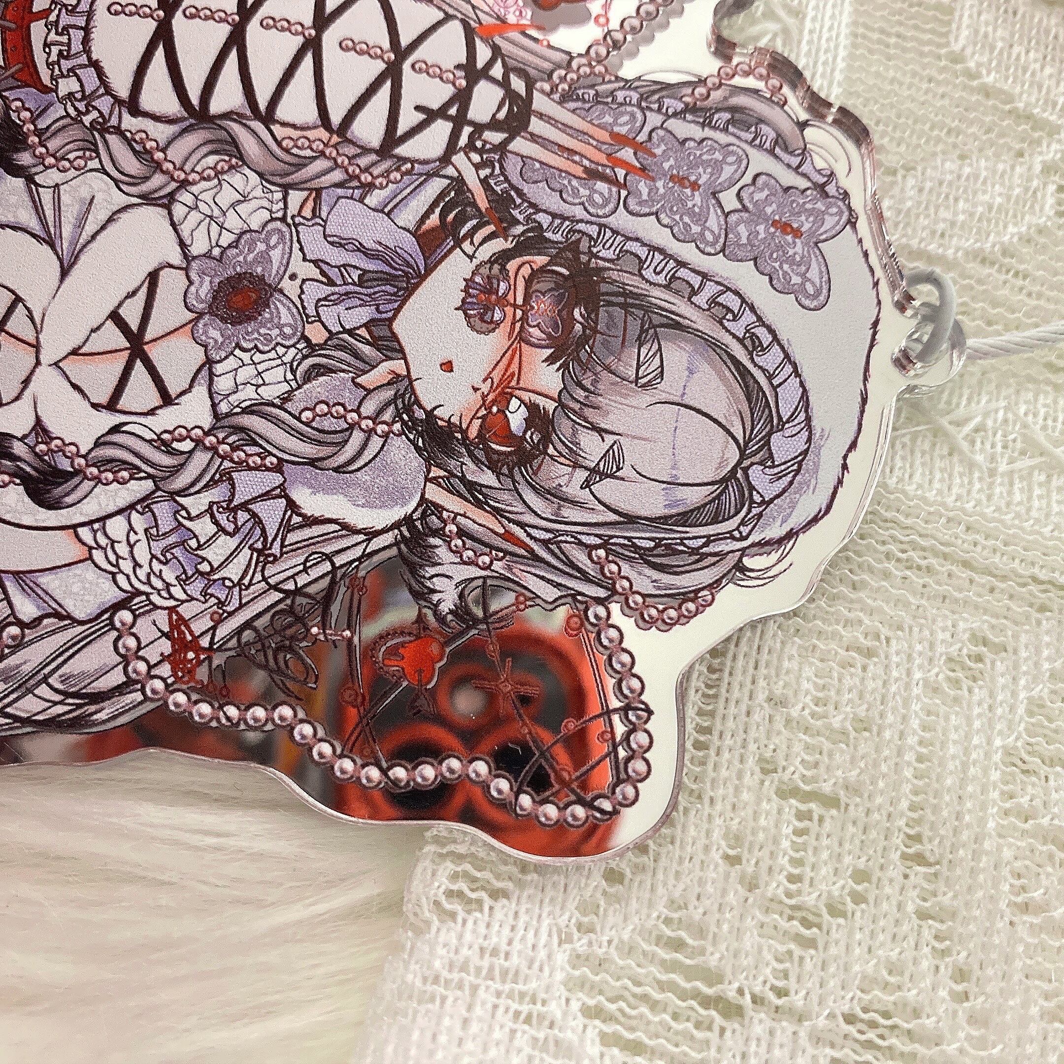 コラボイラストを使用したおおきめサイズのアクリルキーホルダーです!ちゅるんときらきらのミラーアクリルがかわいいです!